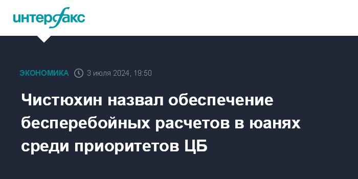 Чистюхин назвал обеспечение бесперебойных расчетов в юанях среди приоритетов ЦБ