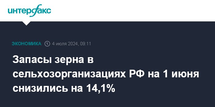 Запасы зерна в сельхозорганизациях РФ на 1 июня снизились на 14,1%