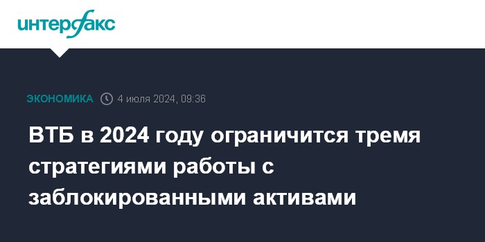 Москва. 4 июля. INTERFAX.RU - ВТБ в 2024 году ограничится тремя стратегиями работы с заблокированными активами, четвертую стратегию, которая была анонсирована, но детально не раскрывалась, банк применять не планирует, заявил "Интерфаксу" первый зампред ВТБ Дмитрий Пьянов.