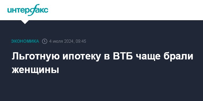 Москва. 4 июля. INTERFAX.RU - Чаще всего ипотеку по льготной программе в ВТБ брали женщины, выяснили в банке в результате исследования.