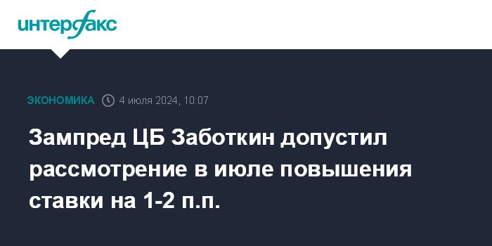 Зампред ЦБ Заботкин допустил рассмотрение в июле повышения ставки на 1-2 п.п.