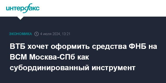 ВТБ хочет оформить средства ФНБ на ВСМ Москва-СПб как субординированный инструмент