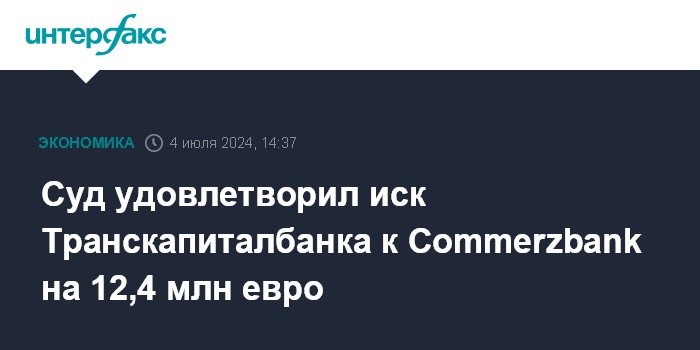 Москва. 4 июля. INTERFAX.RU - Арбитражный суд Москвы удовлетворил иск Транскапиталбанка (ТКБ) к германской "дочке" J.P.Morgan и Commerzbank AG о взыскании 12,4 млн евро.