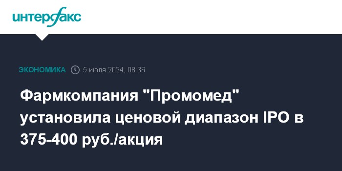 Москва. 5 июля. INTERFAX.RU - Ценовой диапазон IPO ПАО "Промомед" установлен на уровне 375-400 руб./акция, говорится в сообщении фармкомпании.