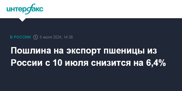 Пошлина на экспорт пшеницы из России с 10 июля снизится на 6,4%