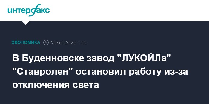 Москва. 5 июля. INTERFAX.RU - В Буденновске Ставропольского края ООО " Ставролен " (100%-я "дочка" "ЛУКОЙЛа") экстренно остановило производство из-за аварии на электрической подстанции, сообщил временно исполняющий полномочия главы Буденновского округа Дмитрий Богданов.
