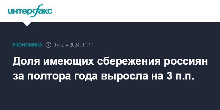 Москва. 8 июля. INTERFAX.RU - Доля россиян, имеющих сбережения в 2024 году, увеличилась на 3 процентных пункта по сравнению с декабрем 2022 года, говорится в совместном исследовании консалтинговой компании "Яков и Партнеры" и холдинга "РОМИР" под названием "Новое российское общество: динамика настроений граждан".