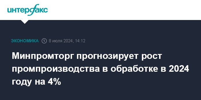 Москва. 8 июля. INTERFAX.RU - Минпромторг прогнозирует рост производства в обрабатывающих отраслях промышленности по итогам 2024 года на уровне 4%, сообщил телеканалу "Россия 24" глава министерства Антон Алиханов.