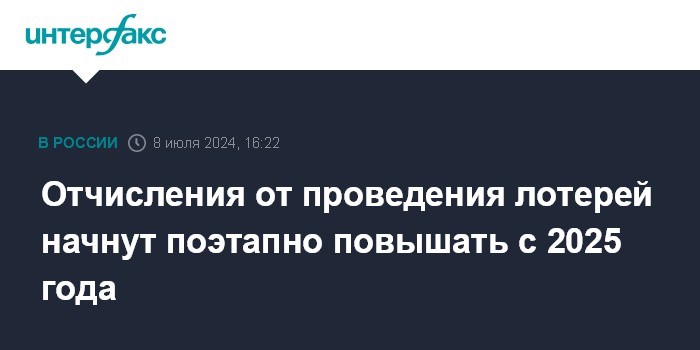 Москва. 8 июля. INTERFAX.RU - Целевые отчисления от проведения лотерей, которые используются для финансирования социально значимых объектов и мероприятий, в том числе, по развитию физкультуры и спорта, будут постепенно увеличиваться с 2025 года в связи с изменением базы, с которой они взимаются.