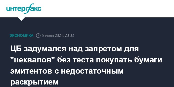 ЦБ задумался над запретом для "неквалов" без теста покупать бумаги эмитентов с недостаточным раскрытием