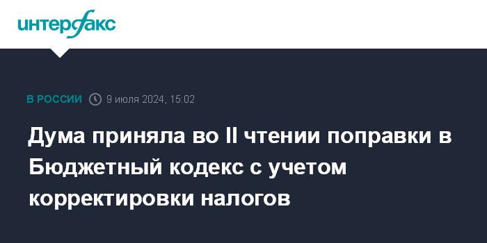 Москва. 9 июля. INTERFAX.RU - Госдума приняла во втором чтении поправки в Бюджетный кодекс, которые учитывают ожидаемые с 2025 г. налоговые изменения в части НДФЛ, налога на прибыль и рентных налогов.