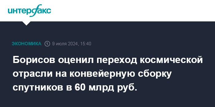 Москва. 9 июля. INTERFAX.RU - Переход российской космической отрасли на серийное производство спутников оценивается в 60 млрд рублей, работы планируется провести в два этапа в 2026-2028 годах, сообщил гендиректор "Роскосмоса" Юрий Борисов.