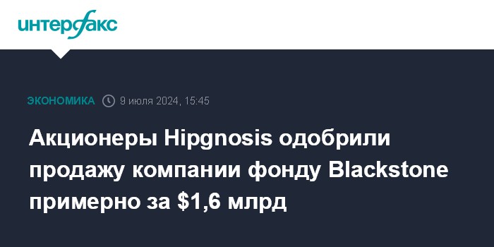 Москва. 9 июля. INTERFAX.RU - Акционеры британской Hipgnosis Songs Fund одобрили предложение американского инвестфонда Blackstone о покупке компании примерно за $1,6 млрд, сообщила Hipgnosis.