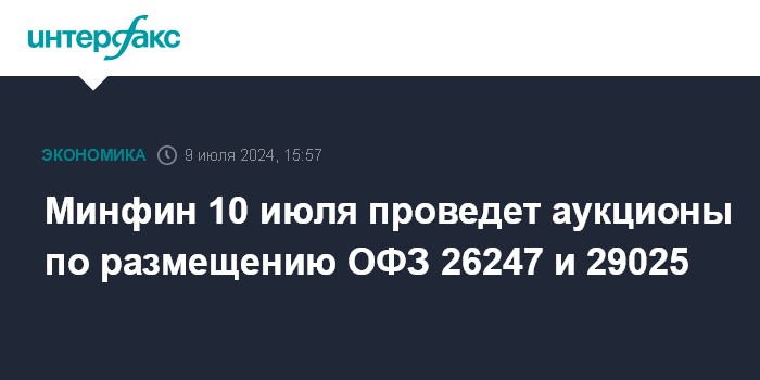 Минфин 10 июля проведет аукционы по размещению ОФЗ 26247 и 29025