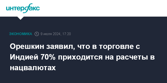 Москва. 9 июля. INTERFAX.RU - Товарооборот между Россией и Индией уже на 70% обслуживается национальными валютами, в перспективе - использование цифровых финансовых активов, заявил журналистам замруководителя администрации президента России Максим Орешкин после переговоров президента Владимира Путина и премьер-министра Индии Нарендры Моди.