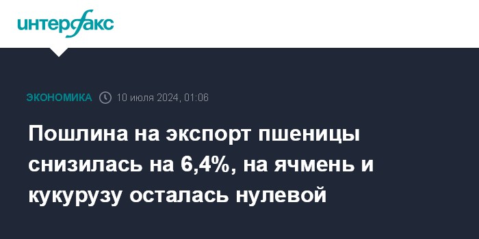 Пошлина на экспорт пшеницы снизилась на 6,4%, на ячмень и кукурузу осталась нулевой