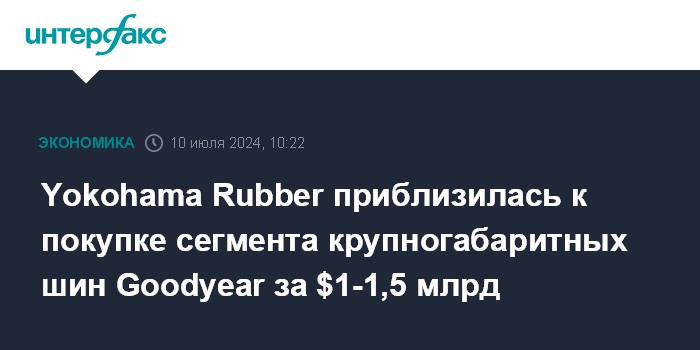 Москва. 10 июля. INTERFAX.RU - Японская Yokohama Rubber находится на продвинутой стадии переговоров о покупке бизнеса американской Goodyear Tire & Rubber Co. в области крупногабаритных (OTR) шин за $1-1,5 млрд, пишет Bloomberg со ссылкой на информированные источники.