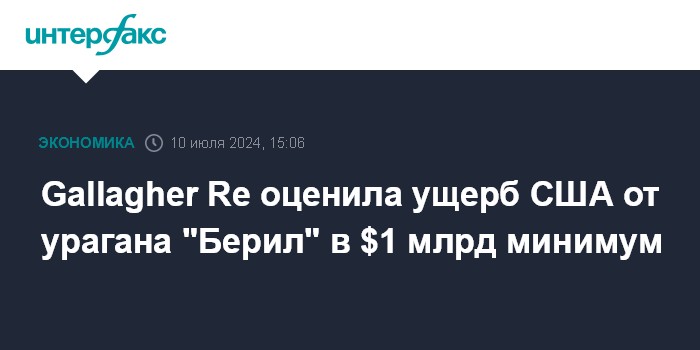 Москва. 10 июля. INTERFAX.RU - Ущерб США от урагана "Берил", обрушившегося в понедельник на побережье Техаса, составляет не менее $1 млрд, пишет Financial Times со ссылкой на предварительные оценки британского страхового брокера Gallagher Re.