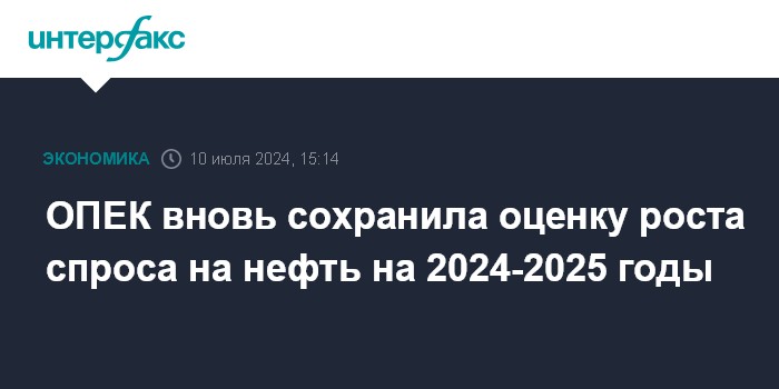 Москва. 10 июля. INTERFAX.RU - ОПЕК сохранила оценку роста мирового спроса на нефть на 2024 год в 2,25 млн баррелей в сутки - до 104,46 млн б/с и еще на 1,85 млн б/с в 2025 году - до 106,31 млн б/с, говорится в ежемесячном отчете организации.