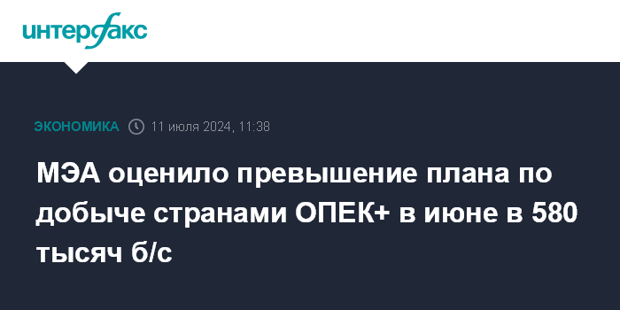 МЭА оценило превышение плана по добыче странами ОПЕК+ в июне в 580 тысяч б/с