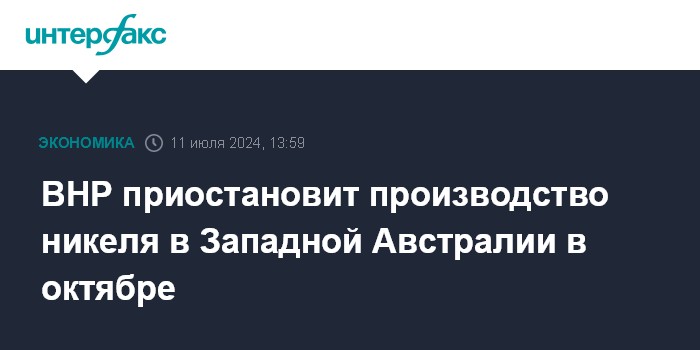 Москва. 11 июля. INTERFAX.RU - Крупнейшая горнодобывающая компания мира BHP с октября приостановит производство никеля в штате Западная Австралия из-за глобального профицита металла.