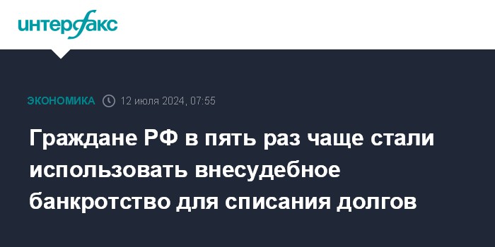 Москва. 12 июля. INTERFAX.RU - Доля внесудебных процедур в общем числе банкротств граждан достигла 12%. В первом полугодии 2024 года стартовали 25 325 внесудебных процедур, суды признали банкротами 191 557 граждан, свидетельствуют данные "Федресурса" (Единый федеральный реестр сведений о банкротстве, fedresurs.ru).