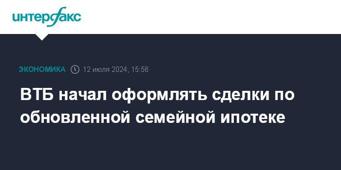 "С 12 июля клиенты ВТБ могут оформить сделки по новым условиям "Семейной ипотеки". Получить кредит смогут те, у кого есть хотя бы один ребенок до шести лет", - говорится в сообщении.
