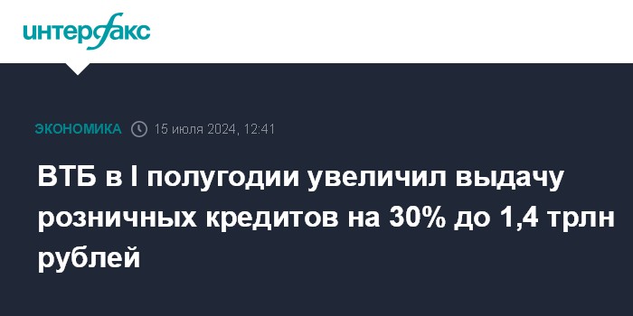 ВТБ в I полугодии увеличил выдачу розничных кредитов на 30% до 1,4 трлн рублей
