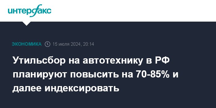 Москва. 15 июля. INTERFAX.RU - Минпромторг опубликовал долгосрочный план индексации утилизационного сбора на автотехнику в РФ, согласно которому в ближайшее время планируется разово повысить сбор на 70-85% и далее - ежегодно индексировать его на 10-20% до 2030 года.