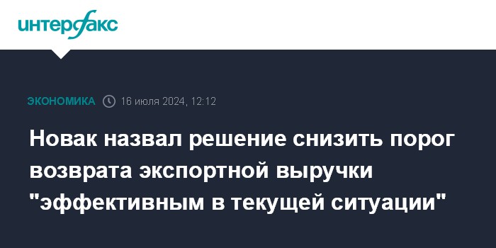 Москва. 16 июля. INTERFAX.RU - Решение вновь уменьшить порог обязательного возврата экспортной выручки спустя менее чем через месяц после предыдущего его снижения эффективно в нынешних условиях, считает вице-премьер Александр Новак.
