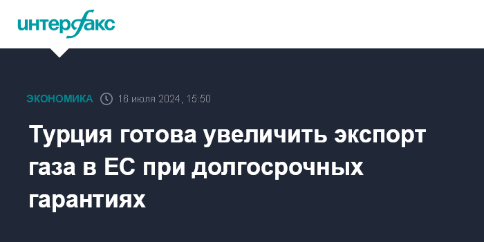 Москва. 16 июля. INTERFAX.RU - Турция готова продавать больше газа в Евросоюз, но хочет долгосрочных обязательств, чтобы оправдать инвестиции в инфраструктуру, а также предпочитает обойтись без сложного свопирования, на котором настаивает ЕС, чтобы избежать поставок российского газа, заявил Bloomberg глава Минэнерго страны Алпарслан Байрактар.