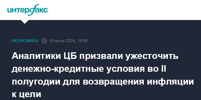 Москва. 16 июля. INTERFAX.RU - Аналитики Банка России в преддверии совета директоров ЦБ по ключевой ставке прибегли к жесткой формулировке о перспективах денежно-кредитной политики, превосходящей по "ястребиности" официальный июньский сигнал регулятора.