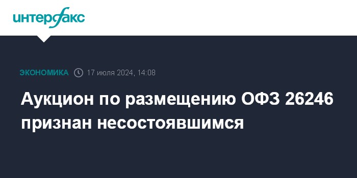 Москва. 17 июля. INTERFAX.RU - Министерство финансов России 17 июля признало несостоявшимся аукцион по продаже ОФЗ-ПД серии 26246 в связи с отсутствием заявок по приемлемым уровням цен, говорится в сообщении Минфина.