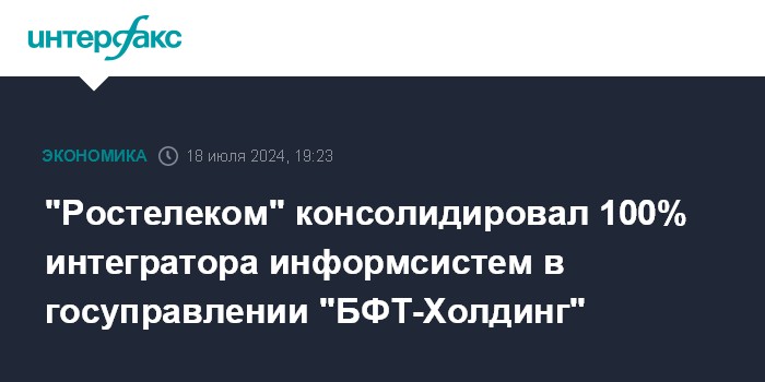Москва. 18 июля. INTERFAX.RU - ПАО "Ростелеком" увеличило долю в ООО "БФТ-Холдинг" (разработчик и интегратор информационных систем в сфере цифровой трансформации государственного управления) с 50,01% до 100%.