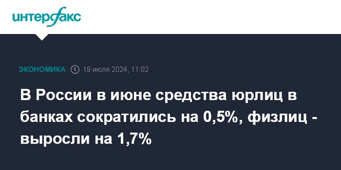В России в июне средства юрлиц в банках сократились на 0,5%, физлиц - выросли на 1,7%