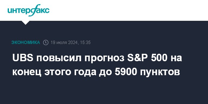 Москва. 19 июля. INTERFAX.RU - Аналитики UBS повысили прогноз для американского фондового индекса S&P 500 на конец этого года до 5900 пунктов с ранее ожидавшихся 5500 пунктов, сообщает MarketWatch.