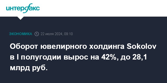 Москва. 22 июля. INTERFAX.RU - Оборот ювелирного холдинга Sokolov в I полугодии 2024 года увеличился на 42% по сравнению с аналогичным периодом прошлого года и достиг 28,1 млрд рублей, говорится в сообщении компании.