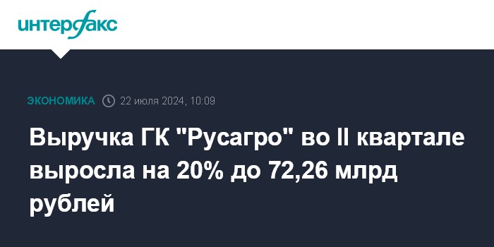 Москва. 22 июля. INTERFAX.RU - Выручка агрохолдинга ГК "Русагро" во втором квартале 2024 года составила 72,26 млрд рублей (до межсегментных элиминаций), что на 20%, больше, чем годом ранее, сообщает компания.