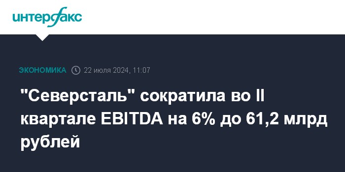 Москва. 22 июля. INTERFAX.RU - "Северсталь" во II квартале 2024 года сократила EBITDA на 6% по сравнению с первым кварталом, до 61,2 млрд рублей, говорится в сообщении компании. Основной причиной падения стало увеличение себестоимости производства во время ремонта доменной печи и приобретение трейдера "А-Групп".