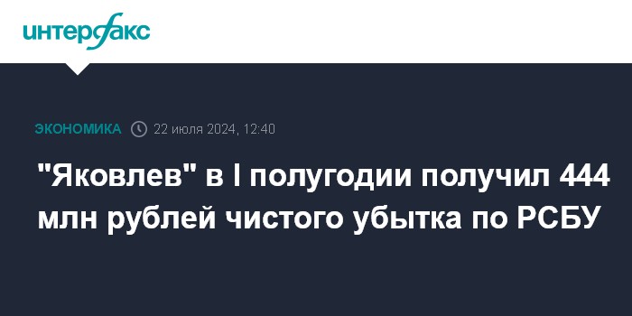 "Яковлев" в I полугодии получил 444 млн рублей чистого убытка по РСБУ