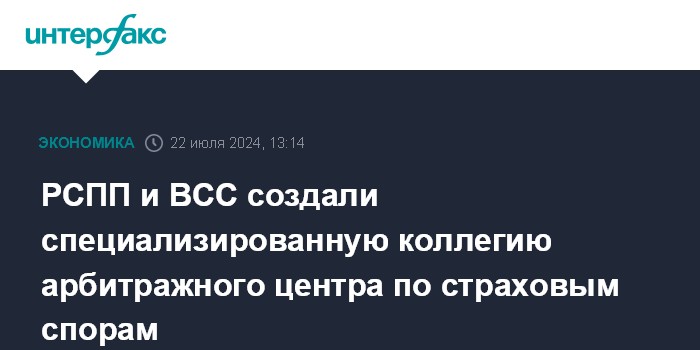 Москва. 22 июля. INTERFAX.RU - При Российском союзе промышленников и предпринимателей (РСПП) создана специализированная коллегия Арбитражного центра по спорам в сфере страхования, распоряжение об этом издал Минюст. Об этом сообщает Всероссийский союз страховщиков (ВСС) в телеграм-канале. Данная коллегия создана при поддержке ВСС.