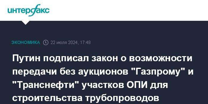 Москва. 22 июля. INTERFAX.RU - Президент РФ Владимир Путин подписал закон, позволяющий "Газпрому" и "Транснефти" без аукционов получать участки недр для добычи общераспространенных полезных ископаемых (ОПИ), необходимых для строительства и реконструкции трубопроводов.