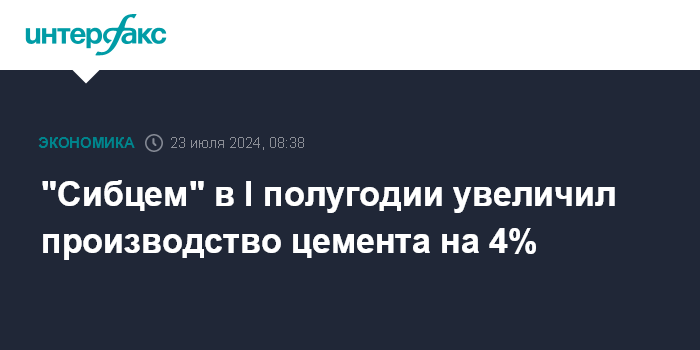Москва. 23 июля. INTERFAX.RU - Холдинг "Сибирский цемент" ("Сибцем") в январе-июне 2024 года увеличил производство цемента на 4% в годовом исчислении, до 2,5 млн тонн, сообщила пресс-служба компании.