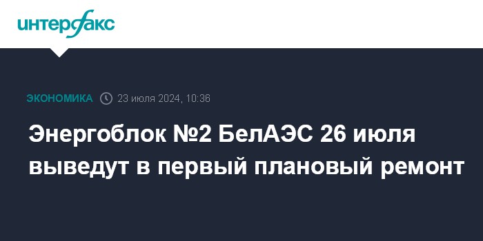 Москва. 23 июля. INTERFAX.RU - Второй энергоблок БелАЭС 26 июля будет выведен в первый планово-предупредительный ремонт, сообщило Минэнерго Белоруссии.