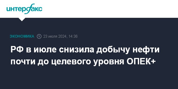 РФ в июле снизила добычу нефти почти до целевого уровня ОПЕК+