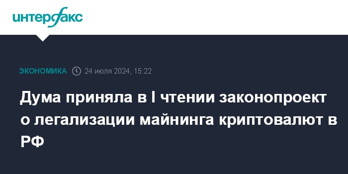 Москва. 24 июля. INTERFAX.RU - Госдума приняла в первом чтении законопроект, который легализует в России деятельность по добыче криптовалют, одновременно вводя запрет на организацию обращения цифровой валюты в РФ, кроме случаев майнинга цифровой валюты и ее дальнейшего распределения.