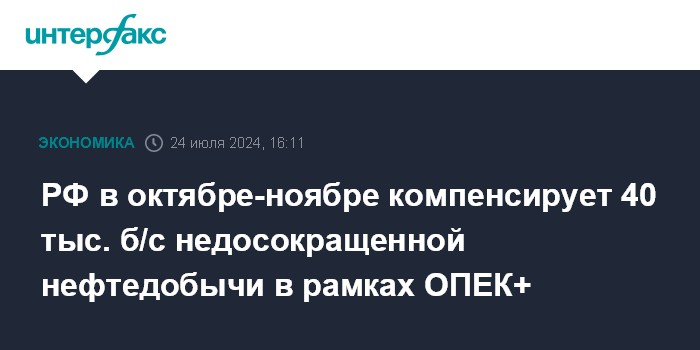 РФ в октябре-ноябре компенсирует 40 тыс. б/с недосокращенной нефтедобычи в рамках ОПЕК+
