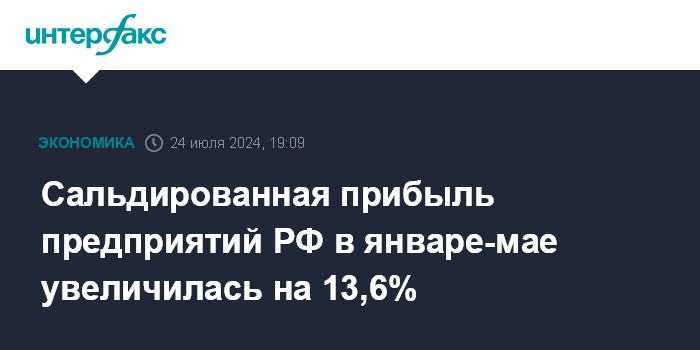 Москва. 24 июля. INTERFAX.RU - Предприятия РФ в январе-мае 2024 года получили сальдированную прибыль (прибыль минус убыток) в размере 13 трлн 043,7 млрд рублей, что на 13,6% больше, чем за аналогичный период прошлого года, сообщил в среду Росстат.