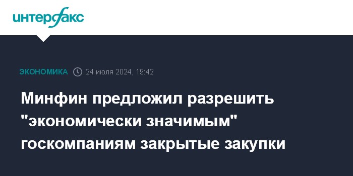 Москва. 24 июля. INTERFAX.RU - Минфин предлагает предусмотреть возможность проведения закрытых конкурентных закупок госкомпаниями и госзаказчиками, отнесенными к числу экономически значимых организаций (ЭЗО), сообщил "Интерфаксу" источник, знакомый с позицией ведомства.