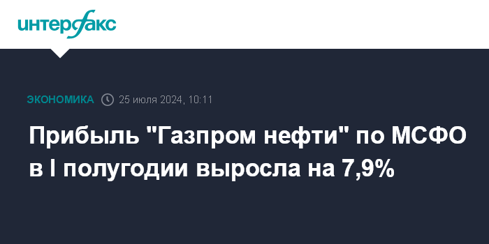 Москва. 25 июля. INTERFAX.RU - В I полугодии 2024 года чистая прибыль "Газпром нефти" по МСФО выросла относительно аналогичного периода прошлого года на 7,9%, составив 328,5 млрд рублей, сообщила компания.